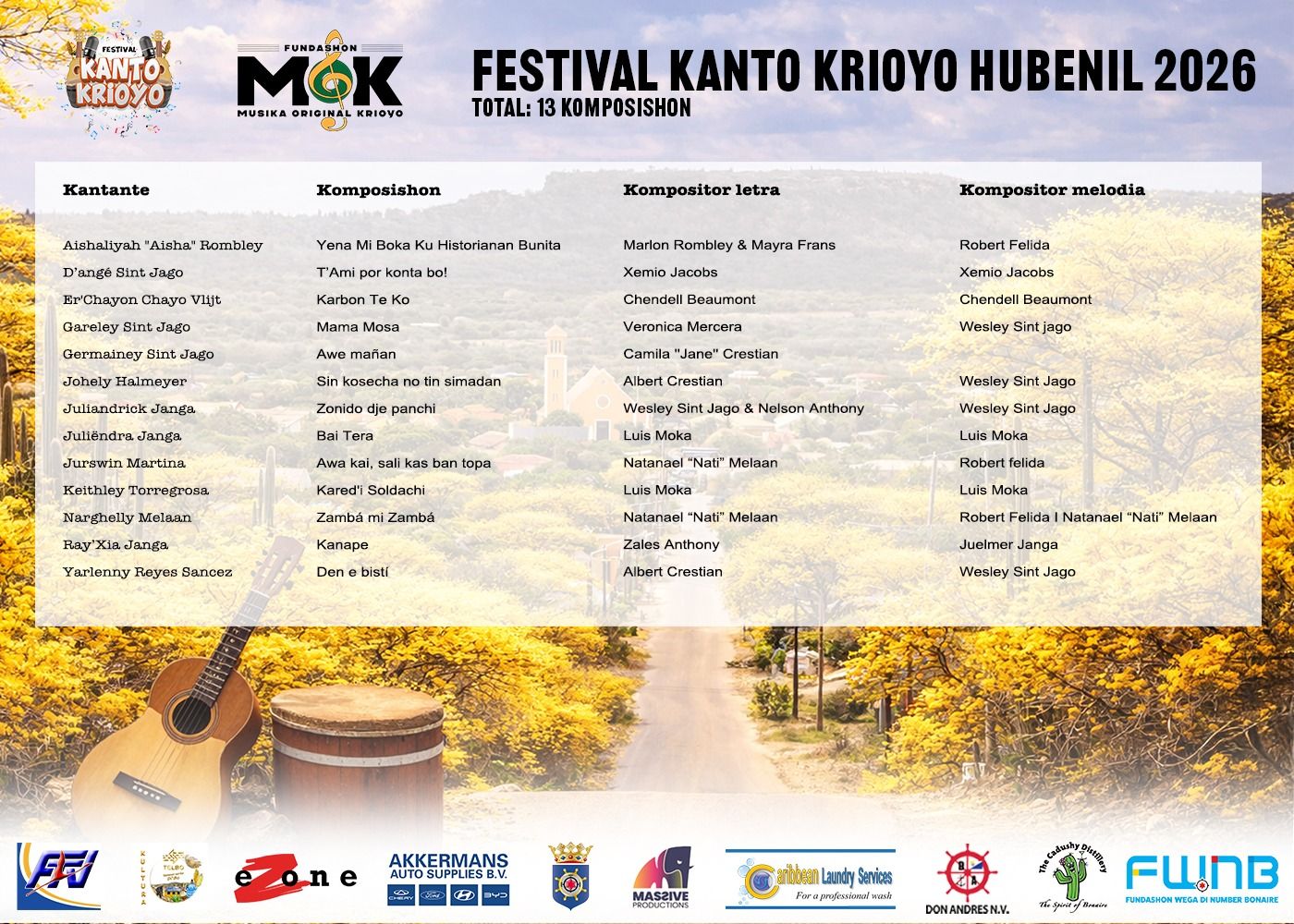 22 di mart anochi, den un ambiente alegre i ameno den Rincon, tabatin e tan sperá inskripshon pa kanto krioyo 2026. E festival, ku ta esun mas grandi den nos komunidat, ta konta ku e aña aki un total di 29 komposishon grandi i 13 komposishon hubenil. Esaki ta reflehá ku interes di nos artistanan pa e evento aki ta sumamente altu.