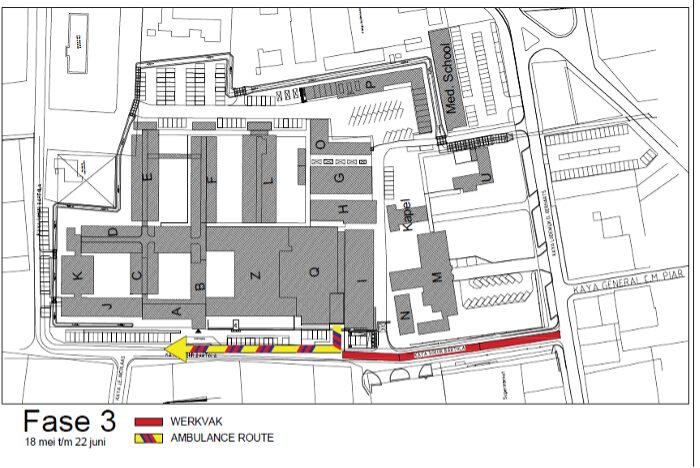 • Fase 3 (Botika te T-kruising Top Supermarket): parker dilanti di Botika no ta posibel, pero lo ta posibel pa parker dilanti di hospital; ruta di ambulans ta mantené; vehíkulonan di karga mester usa porta grandi parti nort.