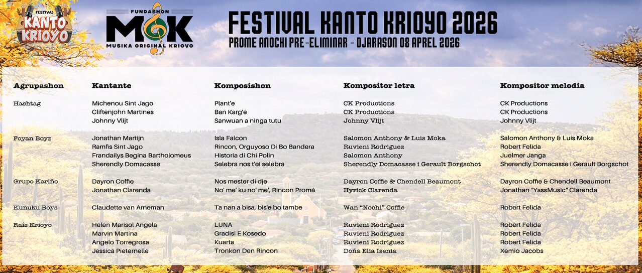 Festival Kanto Krioyo 2026 ta sigui su trayekto ku ophetivo di promové talento lokal i mantené e tradishon di muzik krioyo na Boneiru bibu.